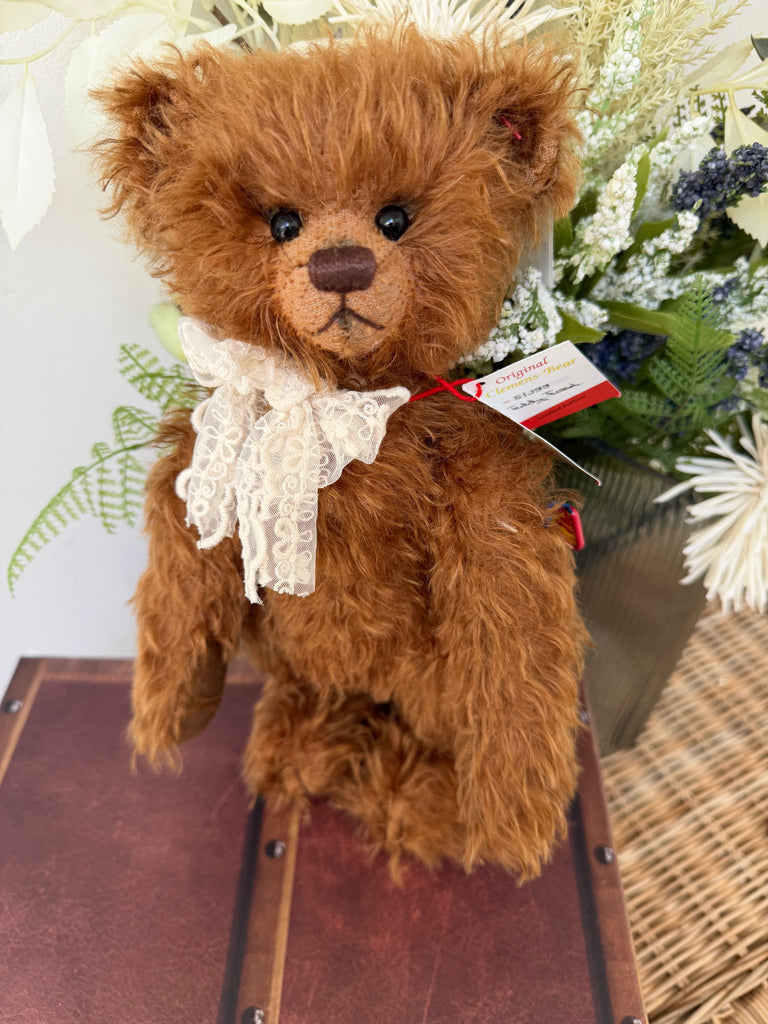 A charming, five way jointed traditional bear made from warm cinnamon coloured mohair, with a pretty ornate lace collar accessory.