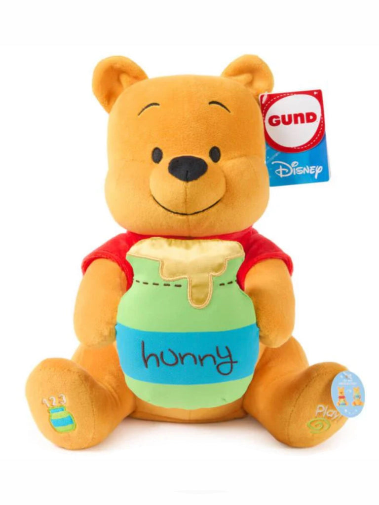 Pooh Bear has a rumbly in his tumbly! Disney's Winnie the Pooh is joining the play date to teach your little one how to count and play peek-a-boo! This soft stuffed animal features the iconic bear looking as cuddly and adorable as ever, designed with a huggable body, soft amber plush, and a velvety red t-shirt. Pooh holds a bright green honeypot in his hands, which has a splash of gold embroidered honey for extra tactile fun. Using the switch on his bottom, parents can wake Pooh Bear up to begin an interactive peek-a-boo game or teach babies to count to three as he counts sips of honey! Pooh raises and lowers his arms as he clutches the honeypot playfully to hide his face. This innovative plush features over 20 whimsical phrases to provide exciting, unique playdates and includes volume controls for a safe, comfortable, and customized play session each time. Elevate everyday play with everyone's favourite silly ol' bear from the Hundred Acre Wood! All facial accents and buttons are embroidered and safe for ages 0 and up. 3 AA batteries included. Surface washable.