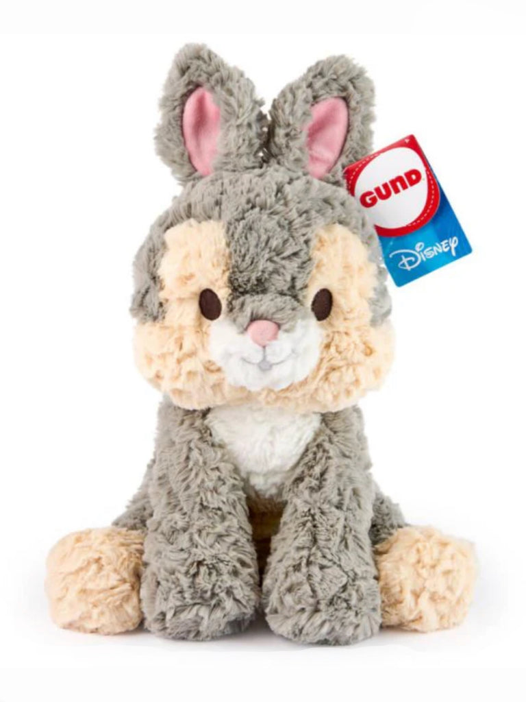Thumper is here from the forest to play! This cuddly stuffed animal has been crafted in GUND's signature Cozys Collection style. Cozys are cuddly companions made from soft, textured fabrics that feel as familiar as hugging an old friend! This irresistibly cute Thumper plush features the iconic bunny rabbit with light grey plush and white accents. Thumper has long, grey upturned ears with soft pink plush lining, and his embroidered facial expression includes a cute smile and a soft pink faux-suede nose. Thumper also boasts a fluffy white puffball tail and cream-coloured back paws that match his face. Like all Cozys animals, this bunny has soft swirls of high-pile plush and floppy limbs built for hugging.