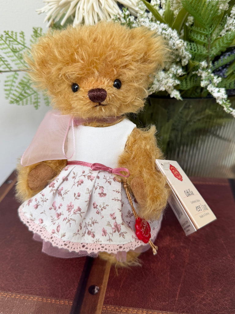 This gorgeous little golden coloured fully jointed Mohair Bear is sure to be admired, complete with her pretty floral summer dress and sheer ribbon Ottilie is dressed to impress !