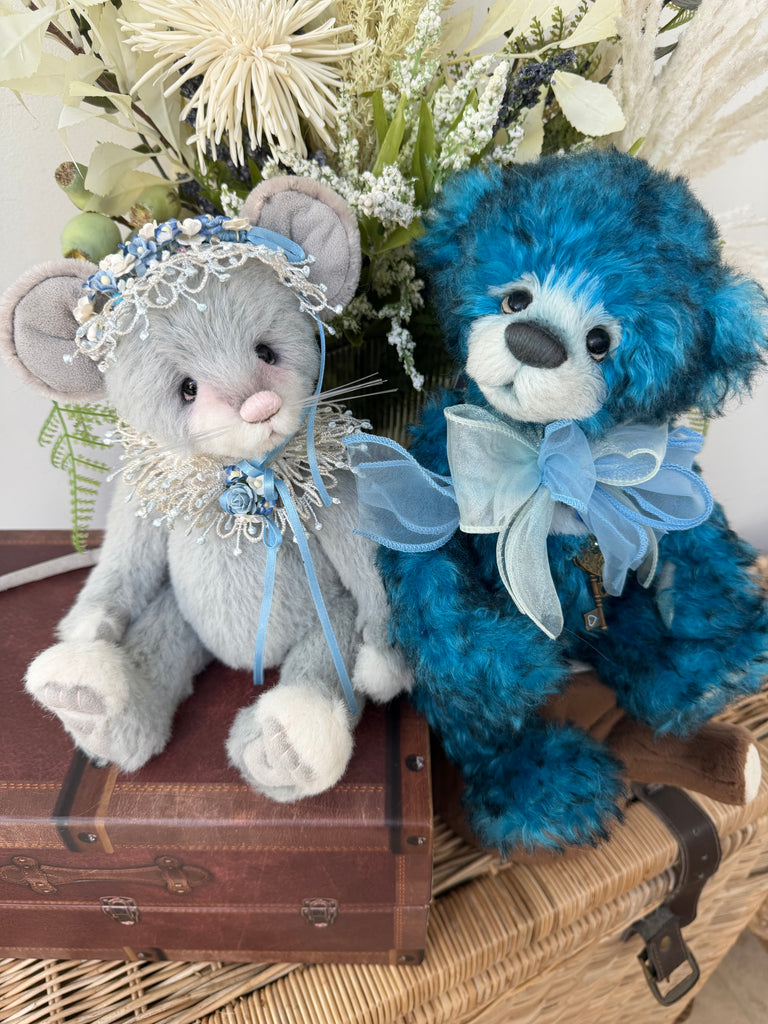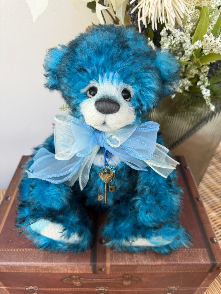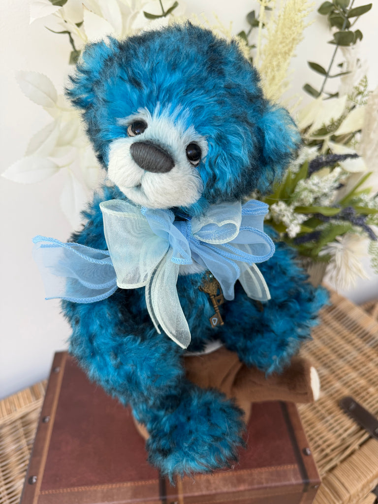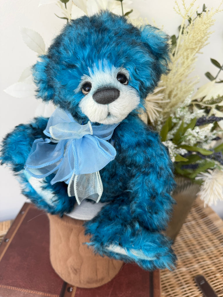 Narnia is a stunning blue bear from the 2024 Collection, and her unique colouring will stand out in any collection. Made with the utmost care and finest attention to detail, Narnia is fully jointed and has been made from a combination of Alpaca & Mohair.