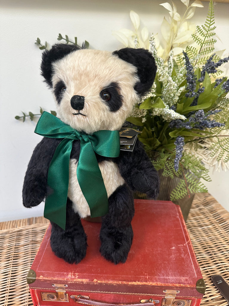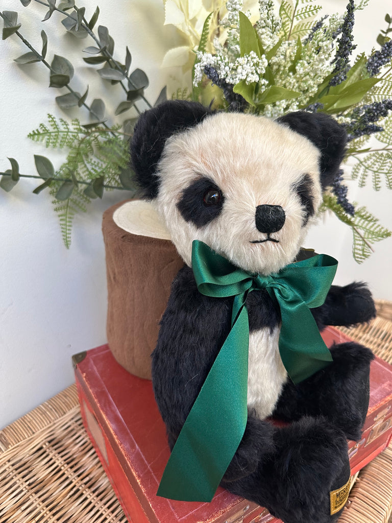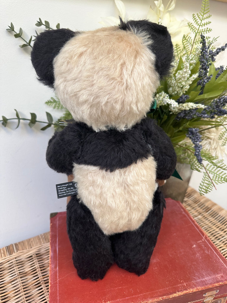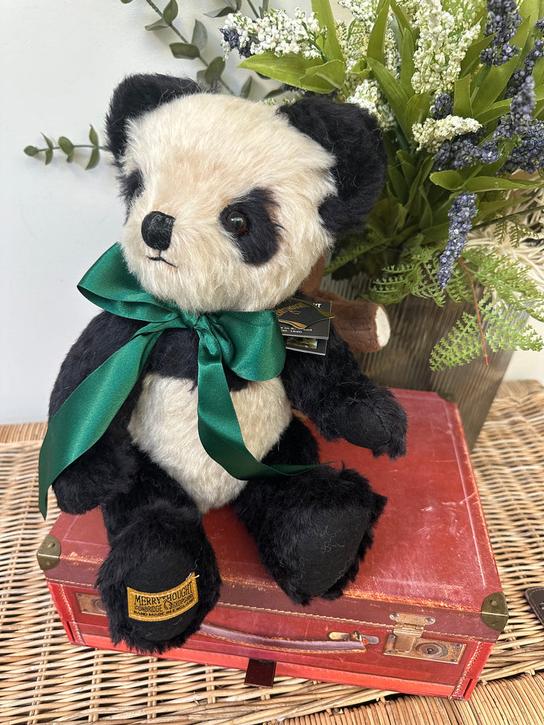 Crafted from rich cream & black mohair, paired with black wool felt pads. Merrythought's much loved Panda Bear has a truly timeless charm about him. A satin British racing green ribbon completes his look.