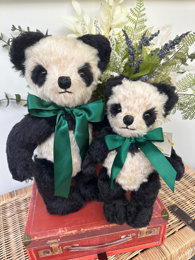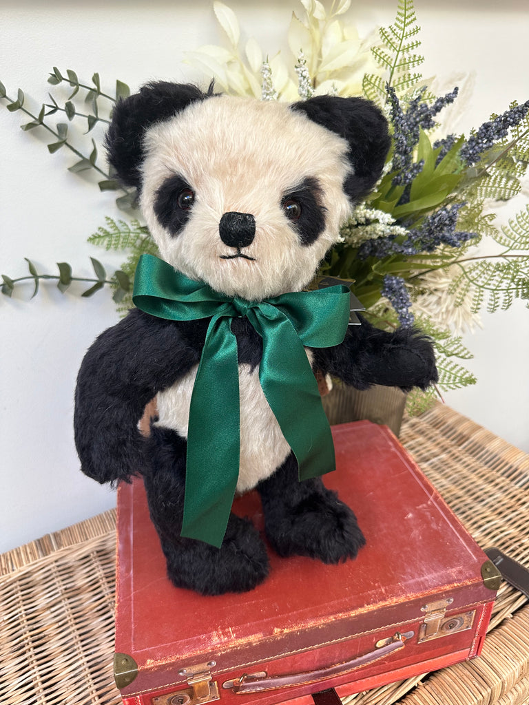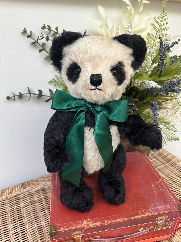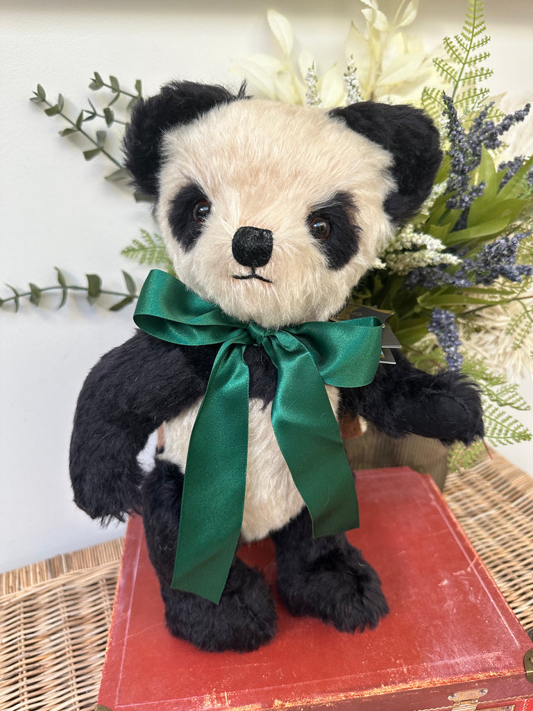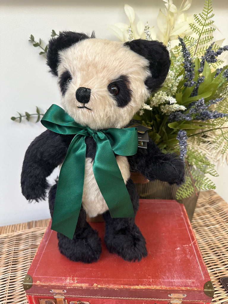 Crafted from rich cream & black mohair, paired with black wool felt pads. Merrythought's much loved Panda Bear has a truly timeless charm about him. A satin British racing green ribbon completes his look.