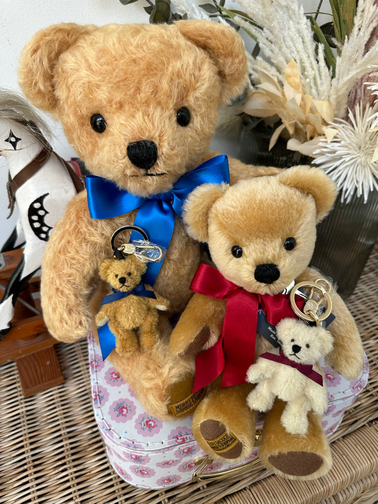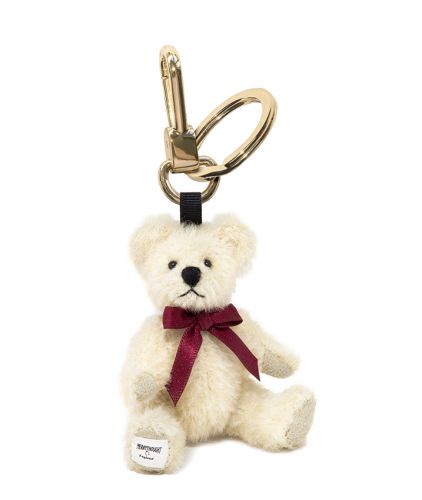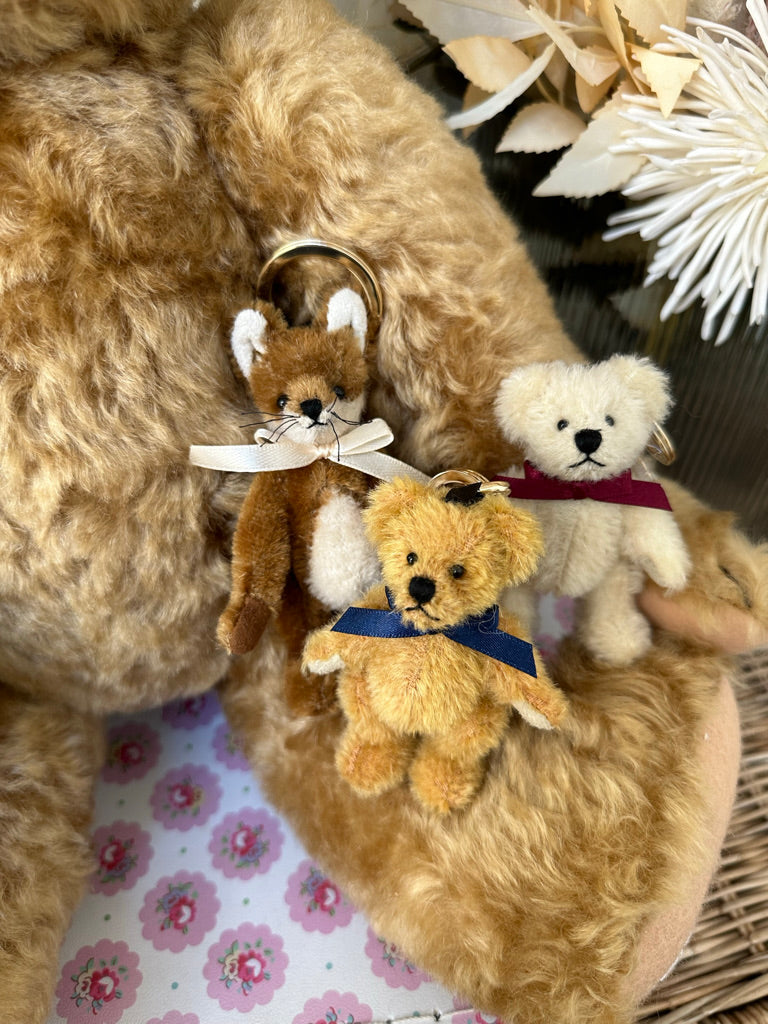 A delightful fully jointed miniature blond teddy bear keyring, with gold-plated hardware made from the finest mohair with a satin bow, who is sure to make the perfect gift !