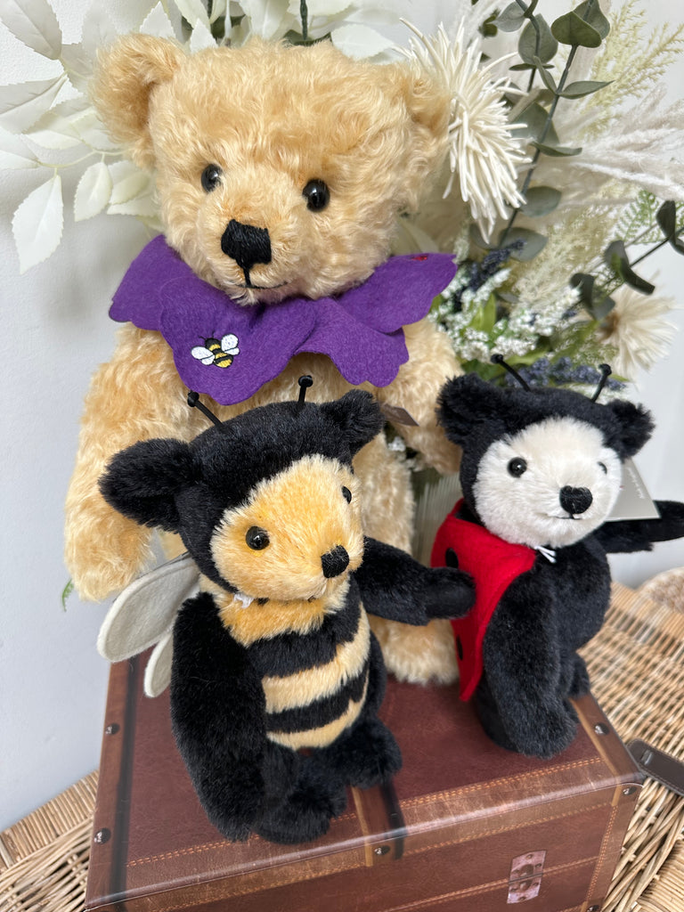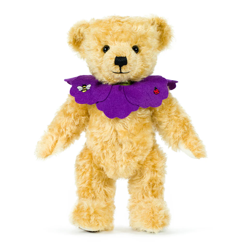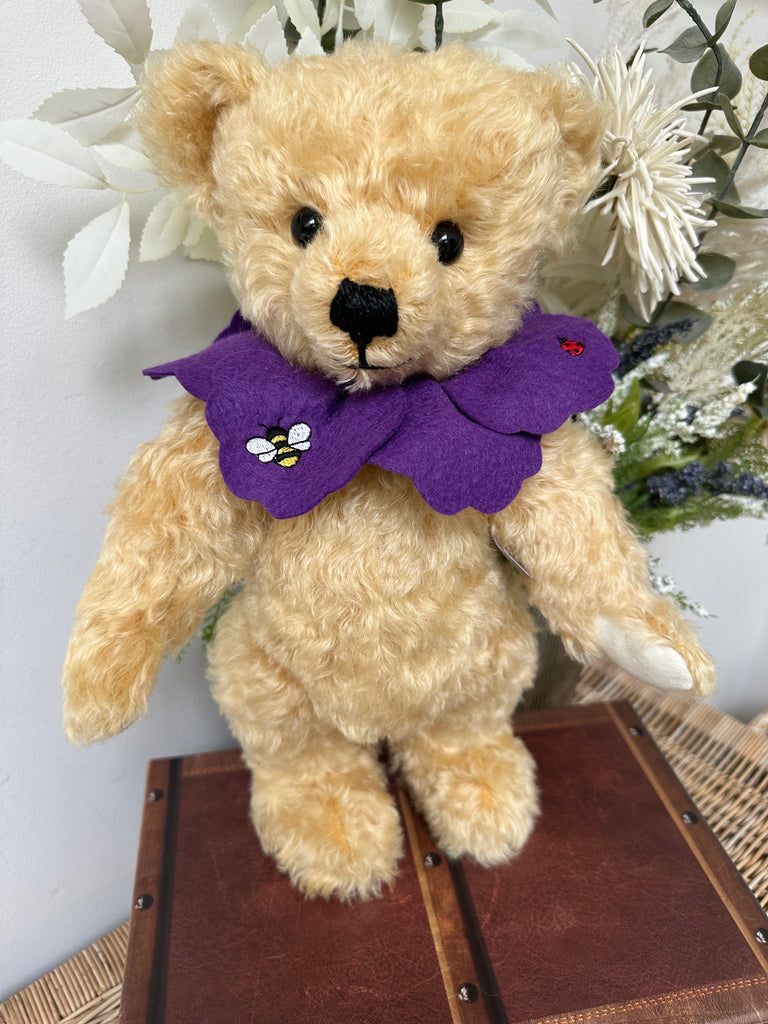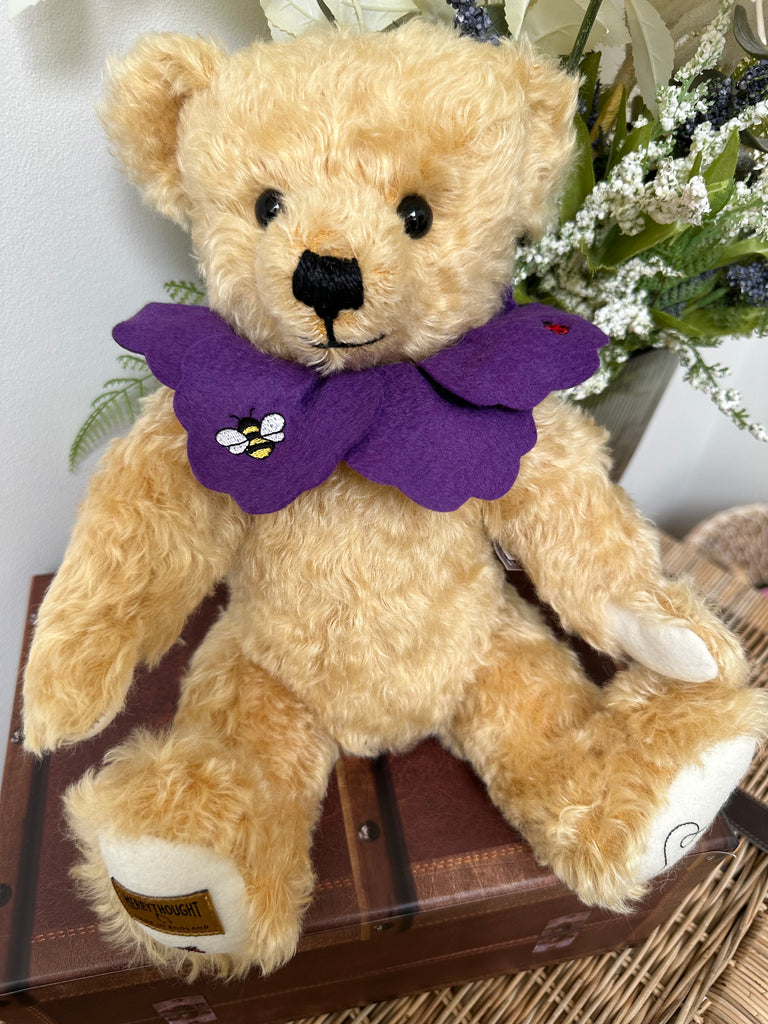 Crafted from the finest honey-gold coloured mohair plush and wool felt, this friendly bear wears a removable pure wool felt ‘petal’ effect collar, secured with a forest green satin ribbon and featuring delicate Bumble Bee and Lady Bird embroidery, which is repeated on the paws.