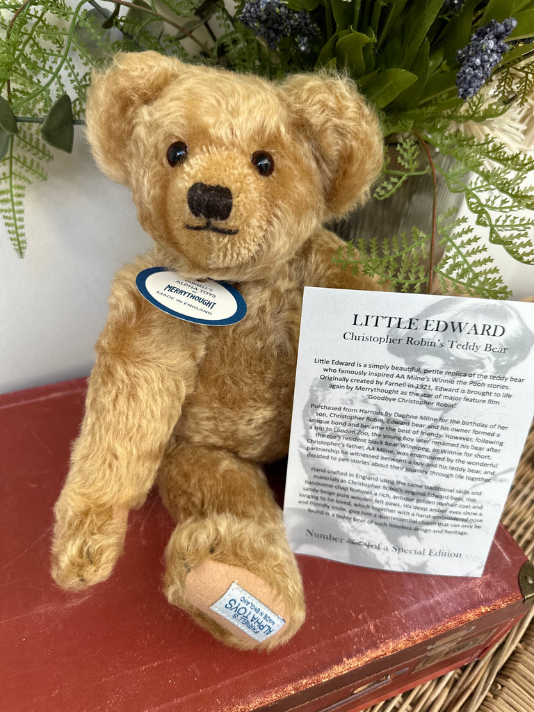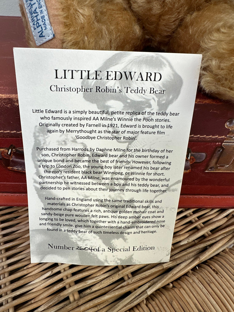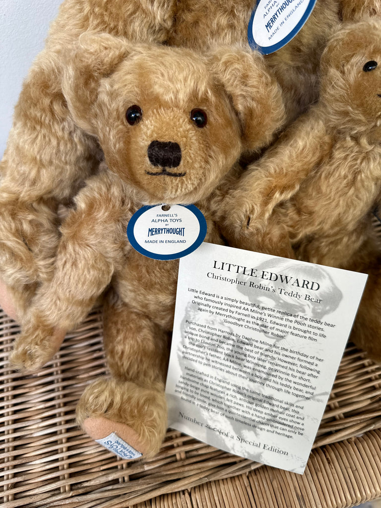 Edward is a stunning replica of the British made teddy bear who famously inspired AA Milne's Winnie the Pooh stories. Originally created by Farnell in 1921, Edward has been brought to life again as the star of the blockbuster film "Goodbye Christopher Robin "