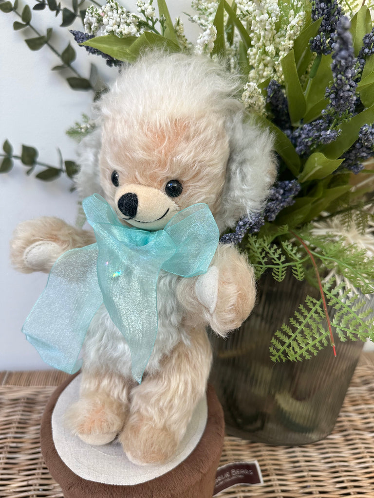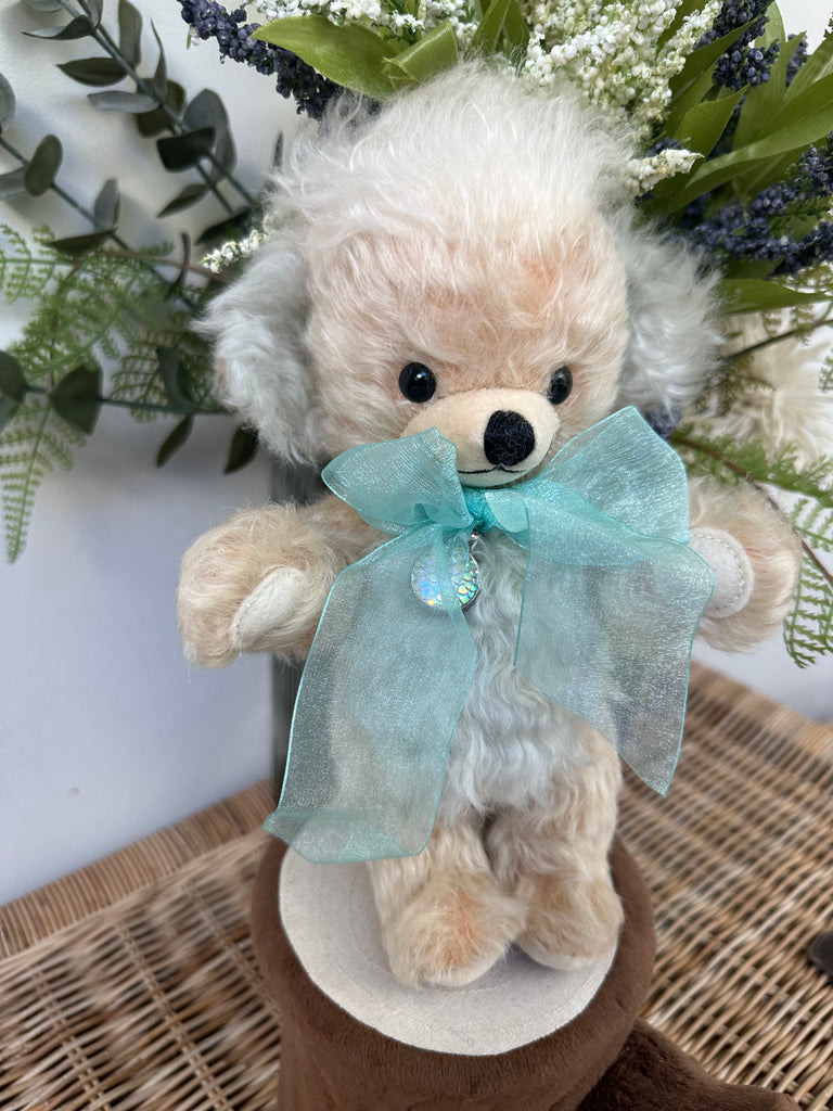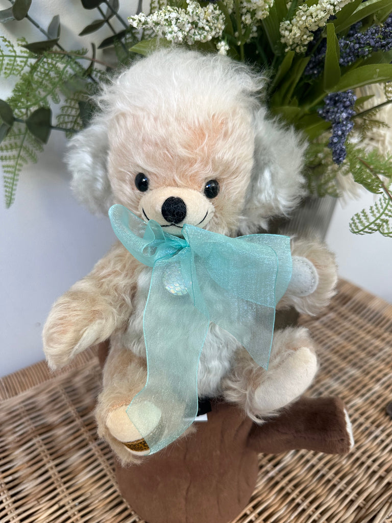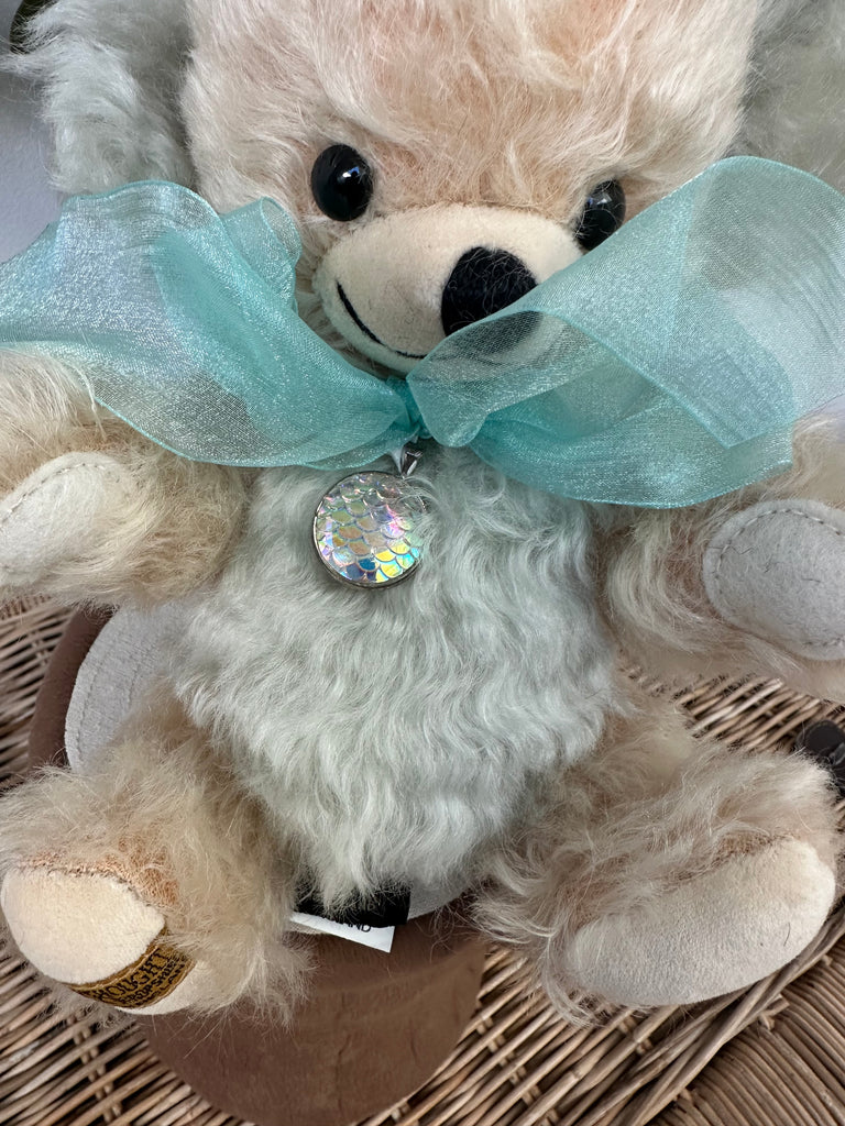 Pear-coloured wavy mohair is beautifully enhanced by the bears pale sea-green inner ears and organza bow, in the centre of which is a decorative silver-plated pendant.