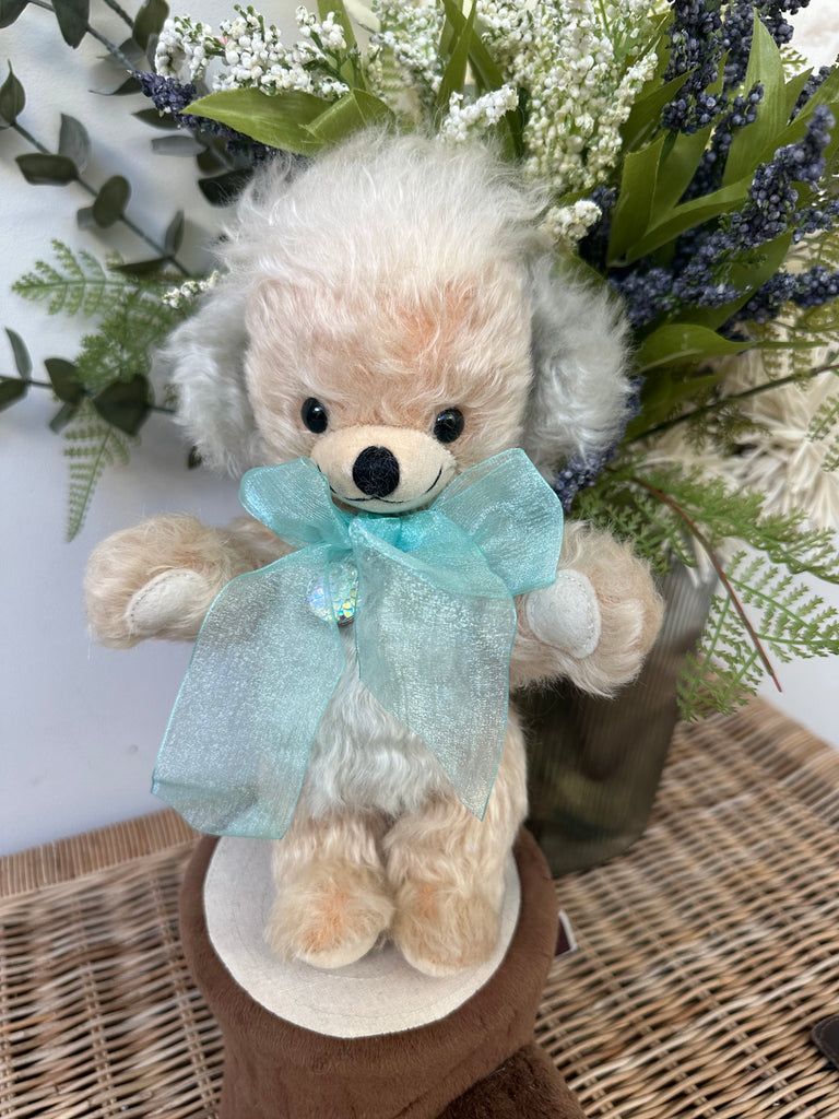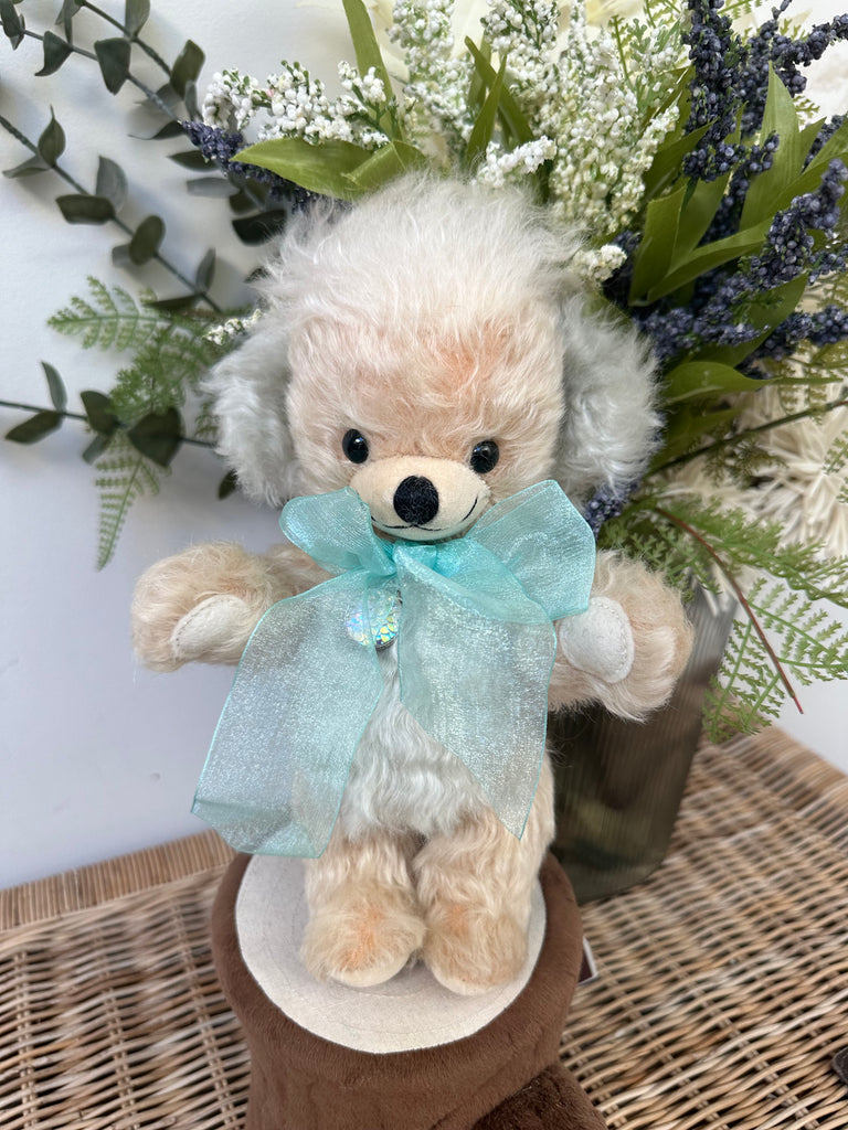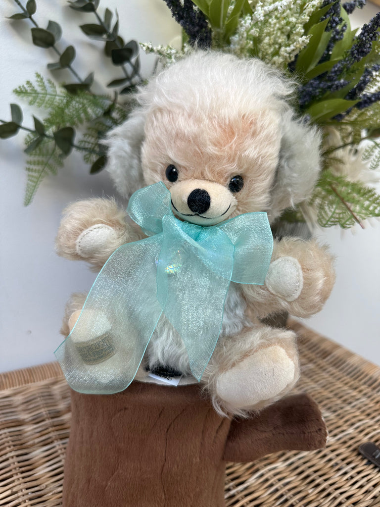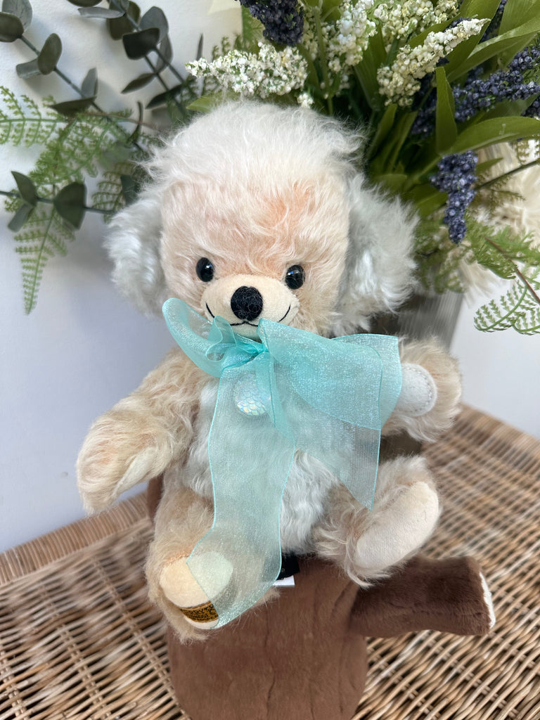 Pear-coloured wavy mohair is beautifully enhanced by the bears pale sea-green inner ears and organza bow, in the centre of which is a decorative silver-plated pendant.