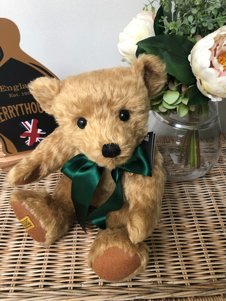 Handmade from the softest golden mohair with milk chocolate pure wool felt paws, Shrewsbury is reminiscent of a good old fashioned and timeless Ted ! complete with a British racing green satin ribbon, he rivals "London Gold " as Merrythought's most popular classic bear.