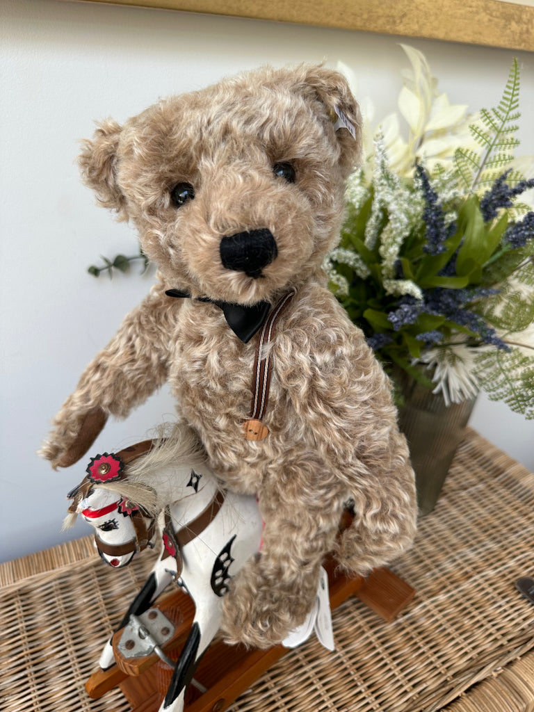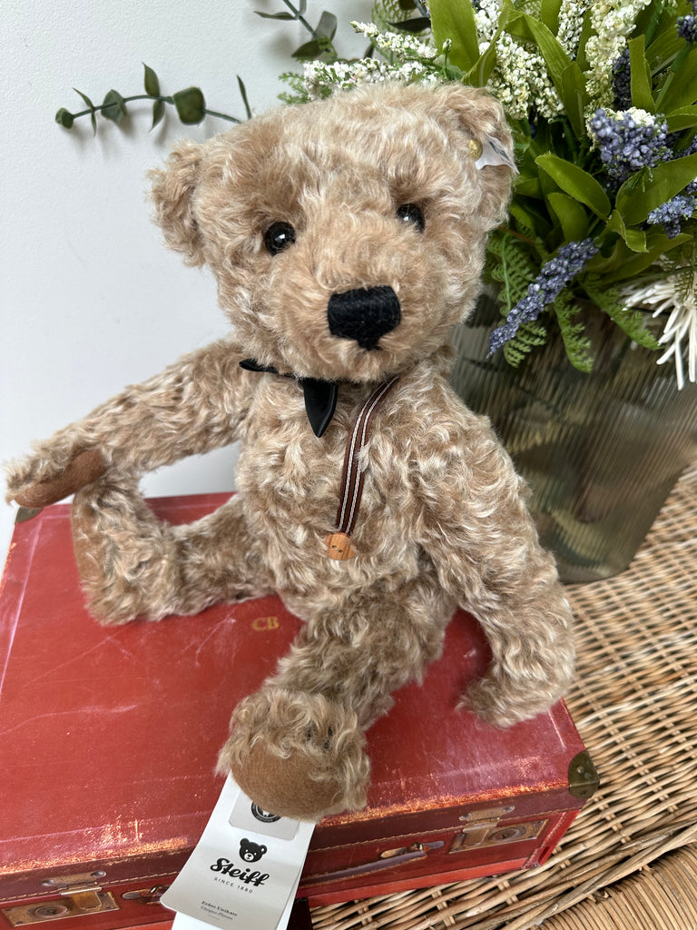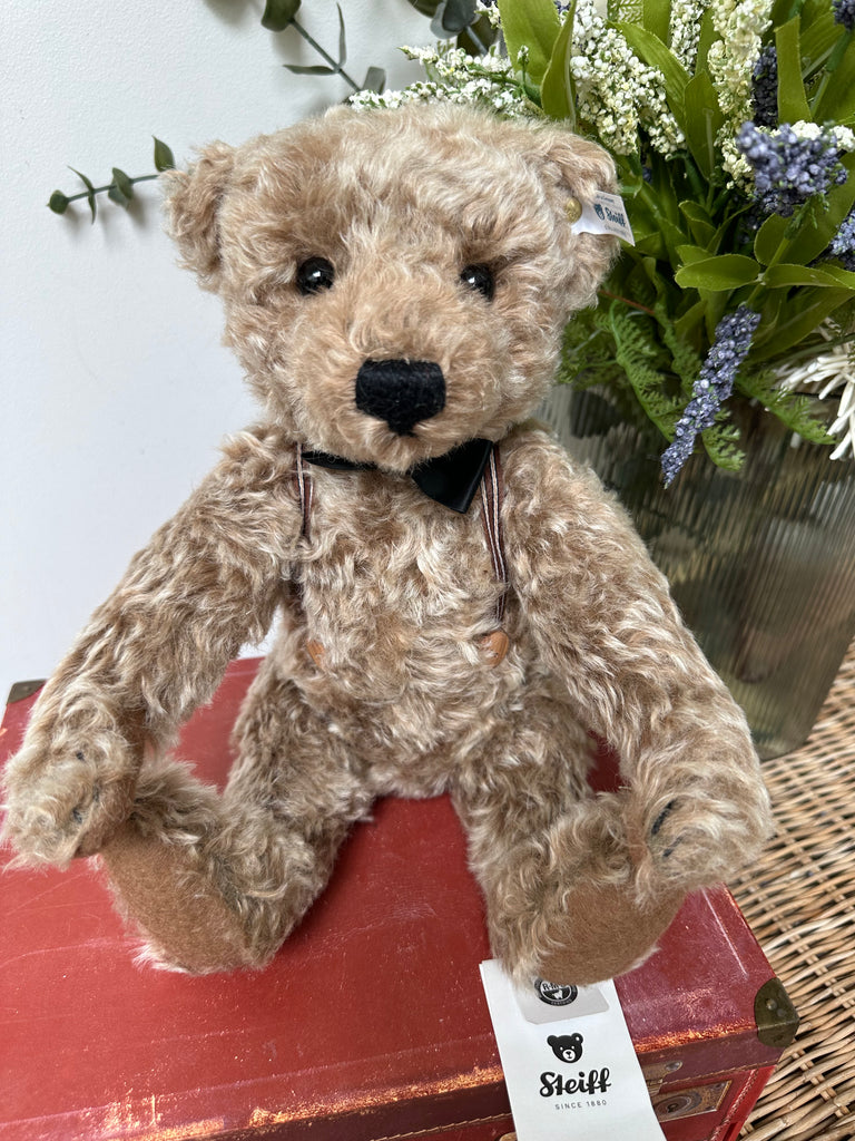 Frederic is the little brother of the larger Steiff Frederic from 2015 who is listed separately. This one is also made of caramel-tipped, high-quality mohair and is 5-way jointed, but measures just 34 cm tall. Frederic wears a bow tie, again made of formal velvet, and striped braces with smart wooden buttons. Just like his predecessor, he is also fitted with a beautiful growler. Get ready to welcome the second original Frederic with a charm all of his own!