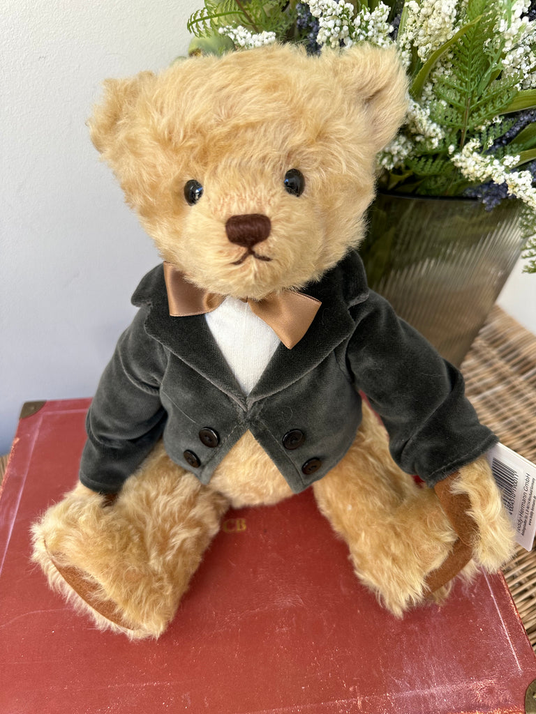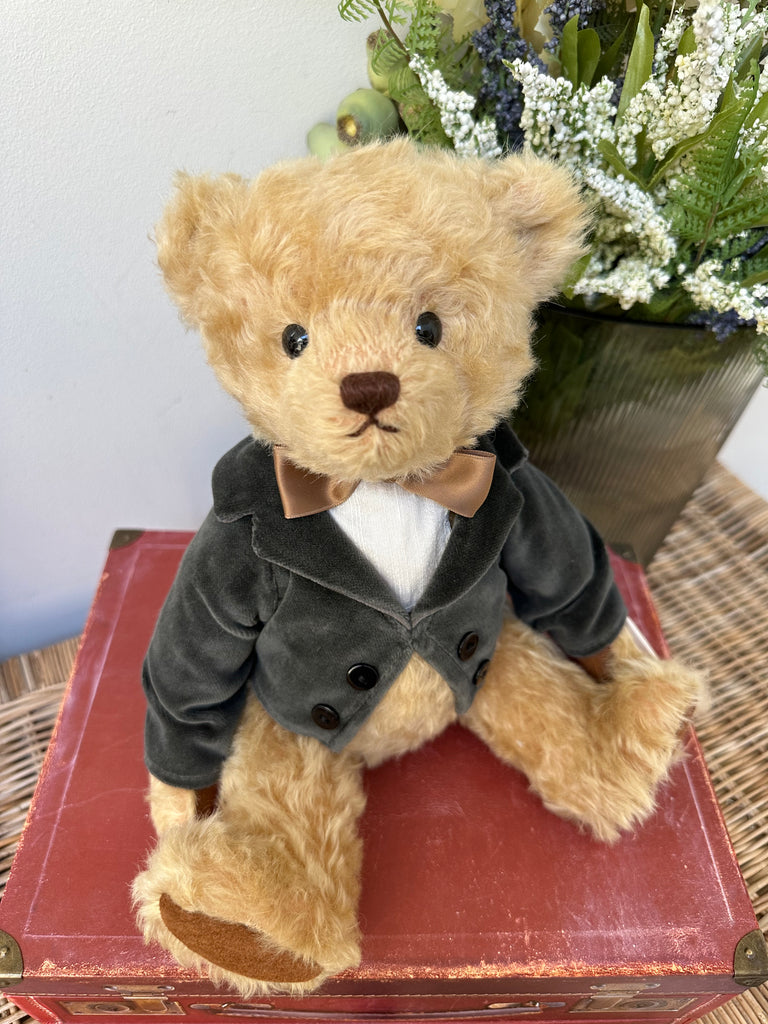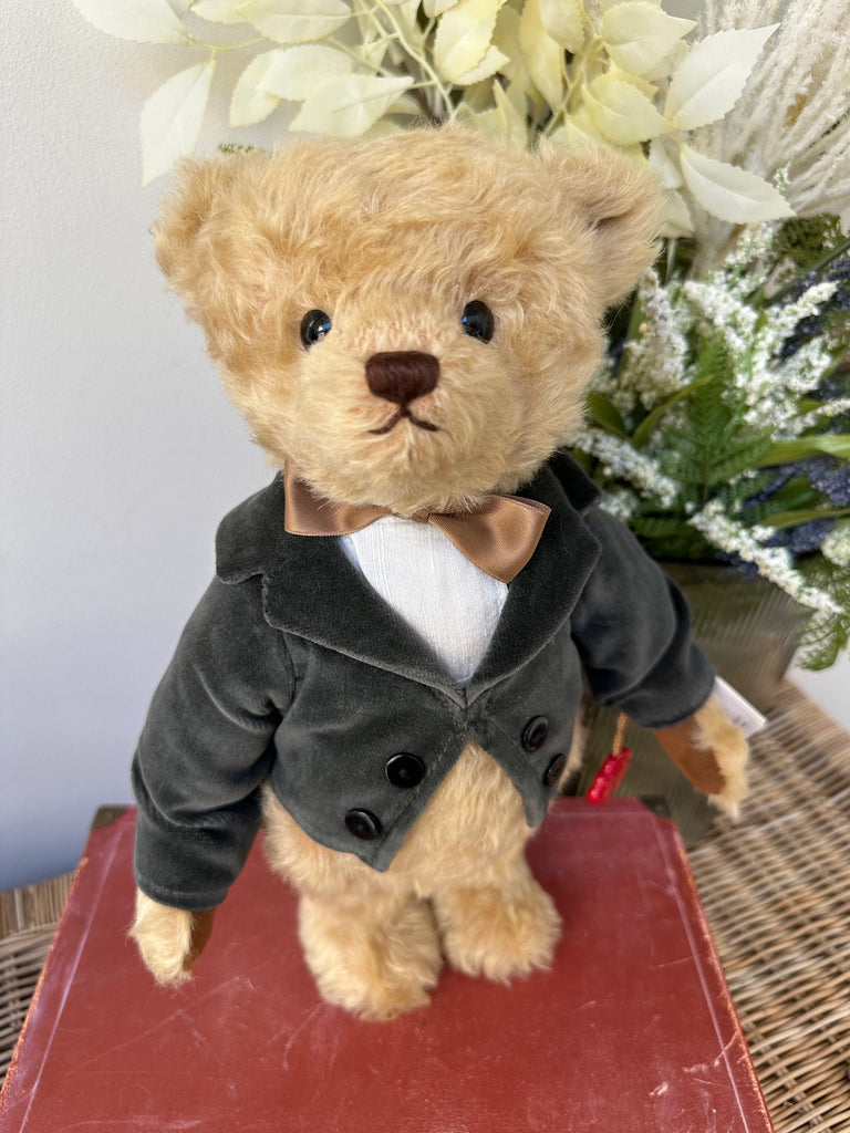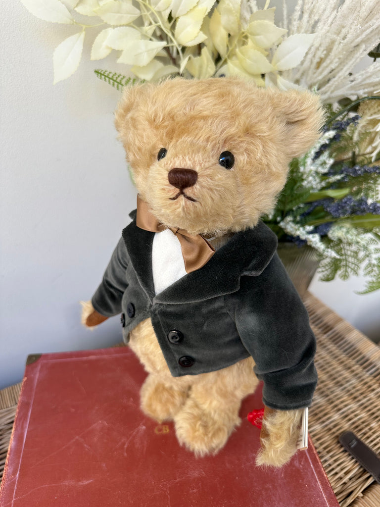 A gorgeous fully jointed, handmade mohair Teddy Bear who is dressed to impress ! with flat feet so he can sit or stand unaided.