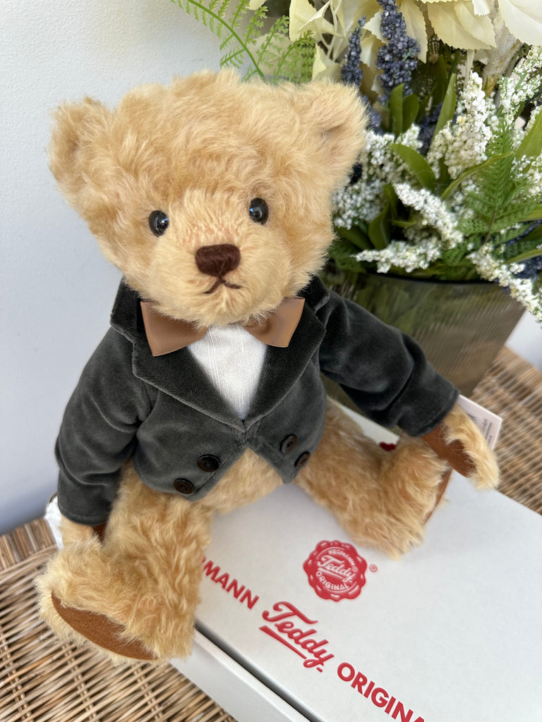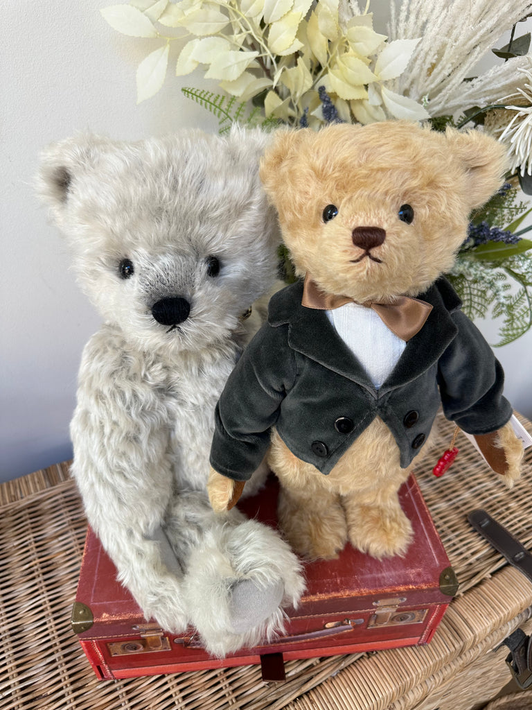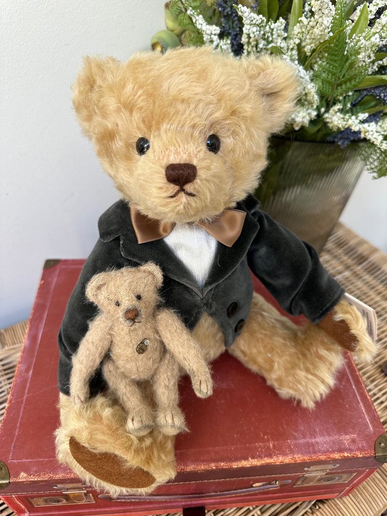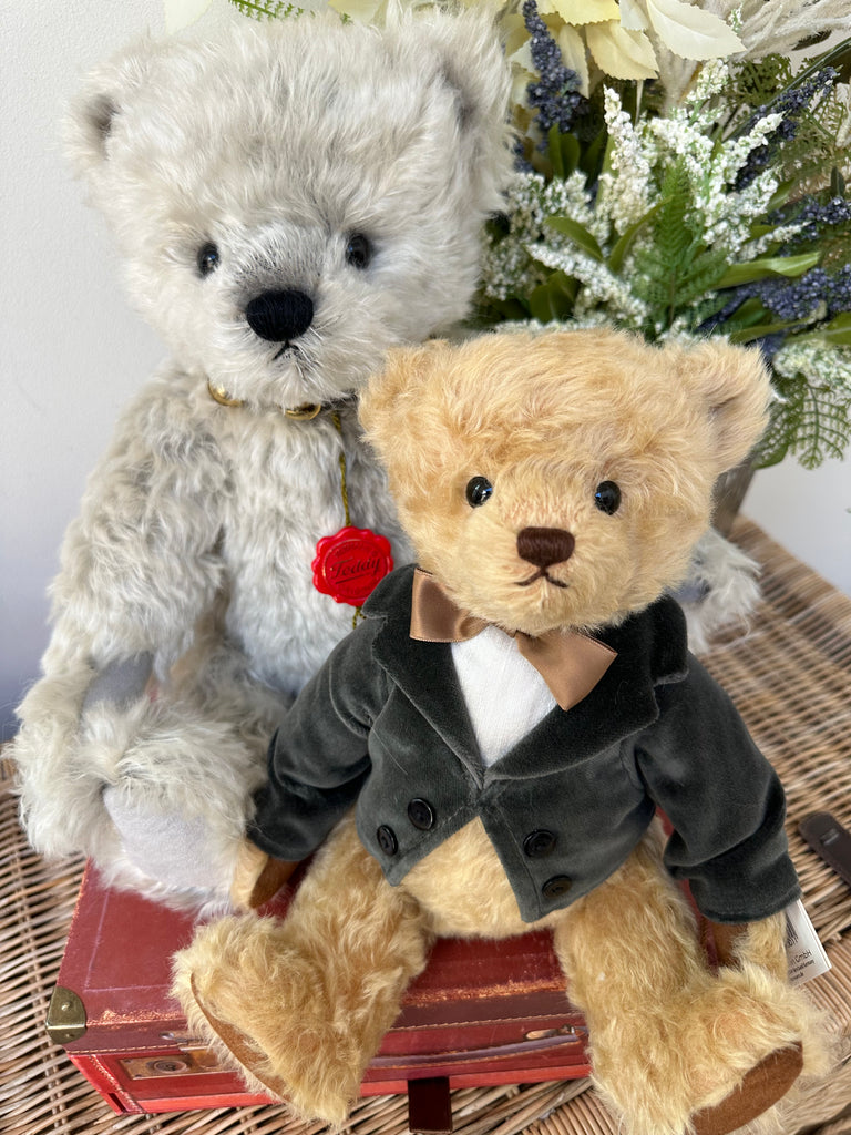 A gorgeous fully jointed, handmade mohair Teddy Bear who is dressed to impress ! with flat feet so he can sit or stand unaided.