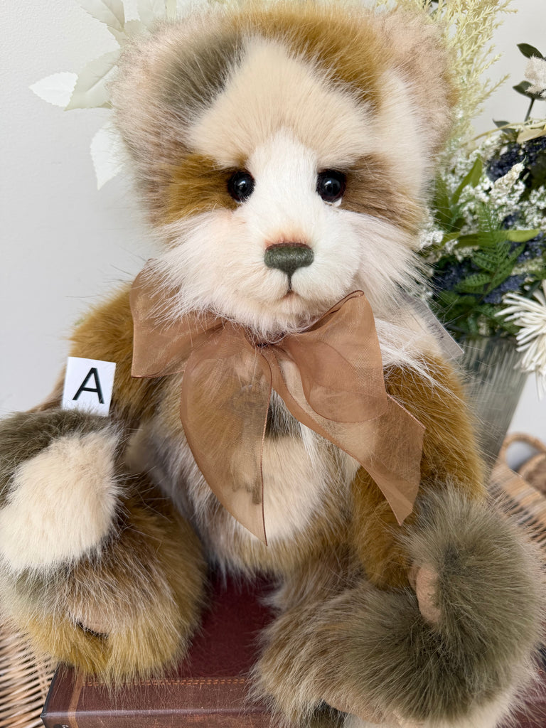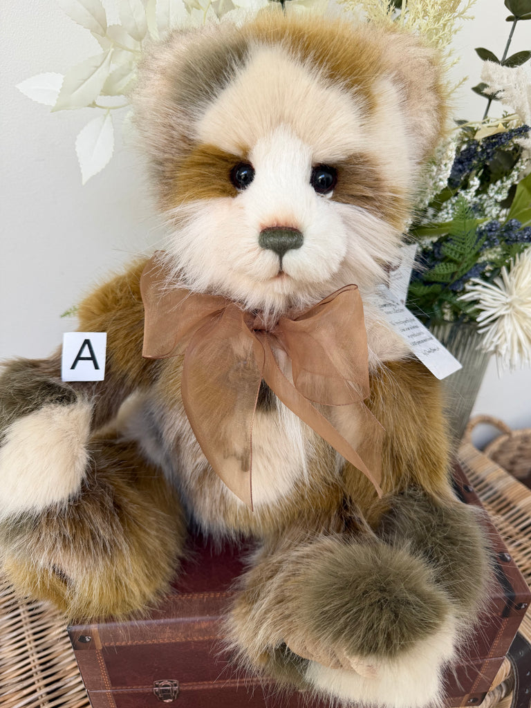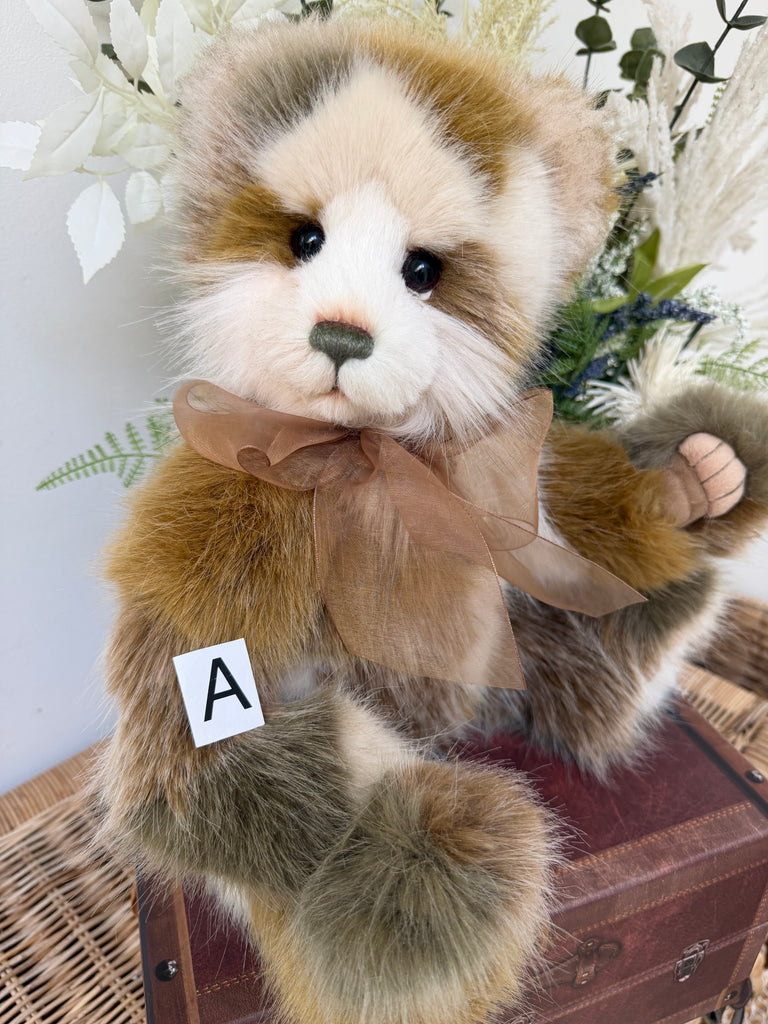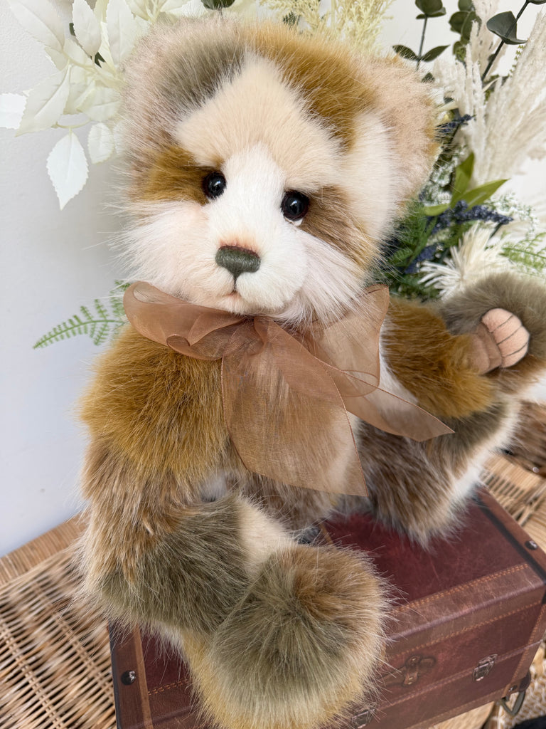 Plumo Bears sit within Charlie Bears Plush Collection but, in addition to the softest plush fabrics, they also have beautiful natural fibres such as Alpaca and Mohair accents. These natural fibres are to add finer detailing around the face and ears and this special combination is what Charlie Bears call "Plumo" Bears, and in this particular design the mohair is quite sparse around the muzzle.