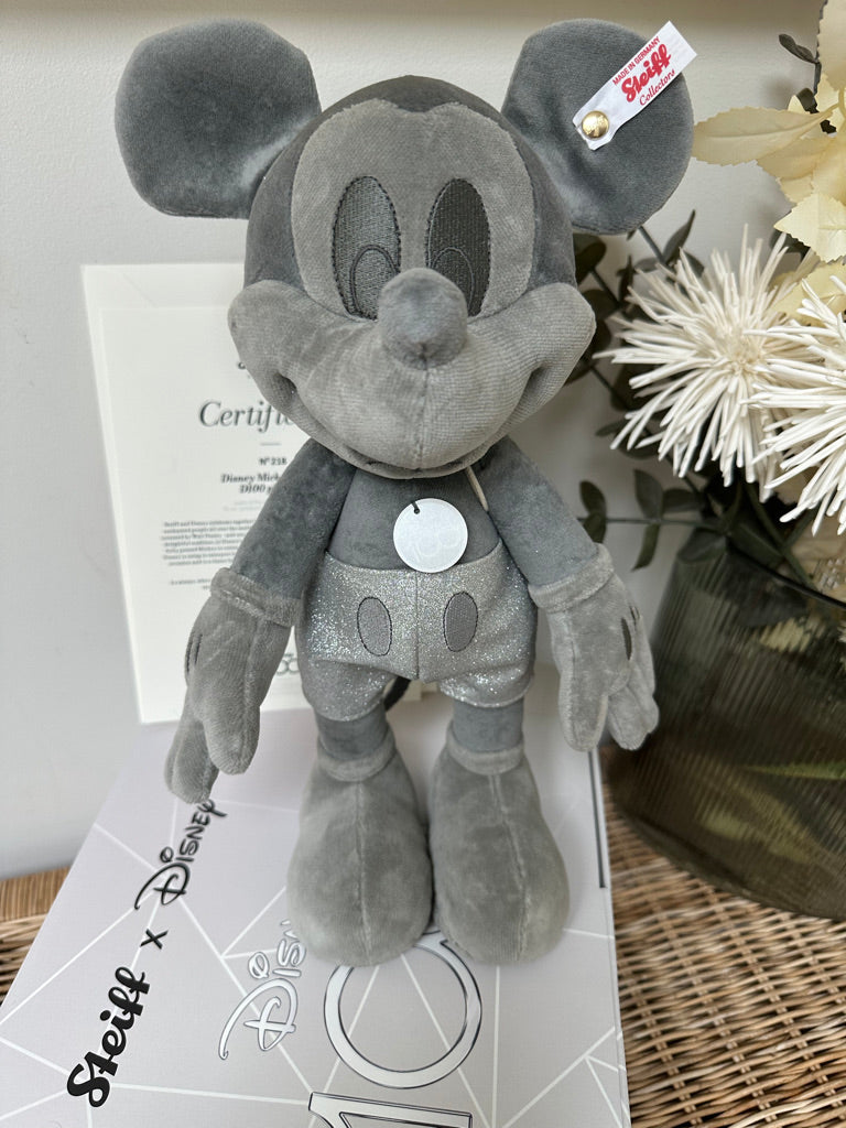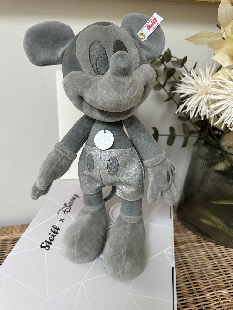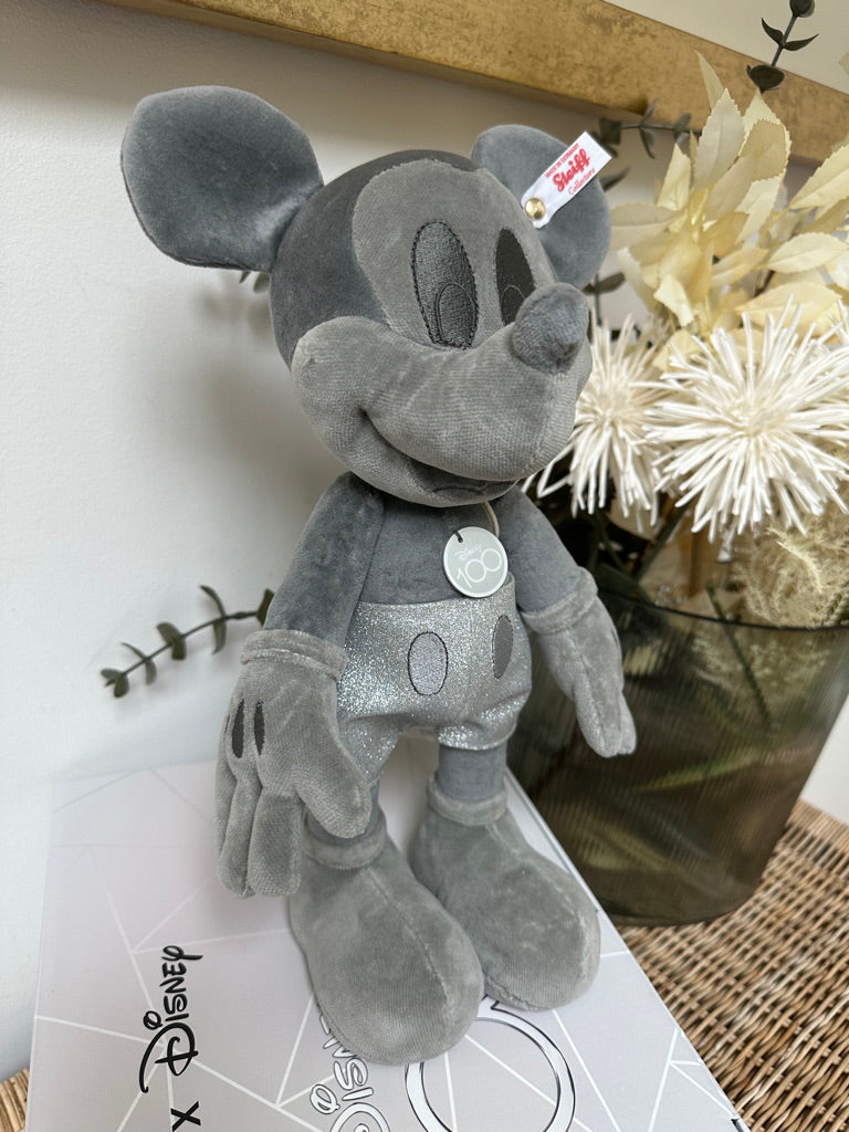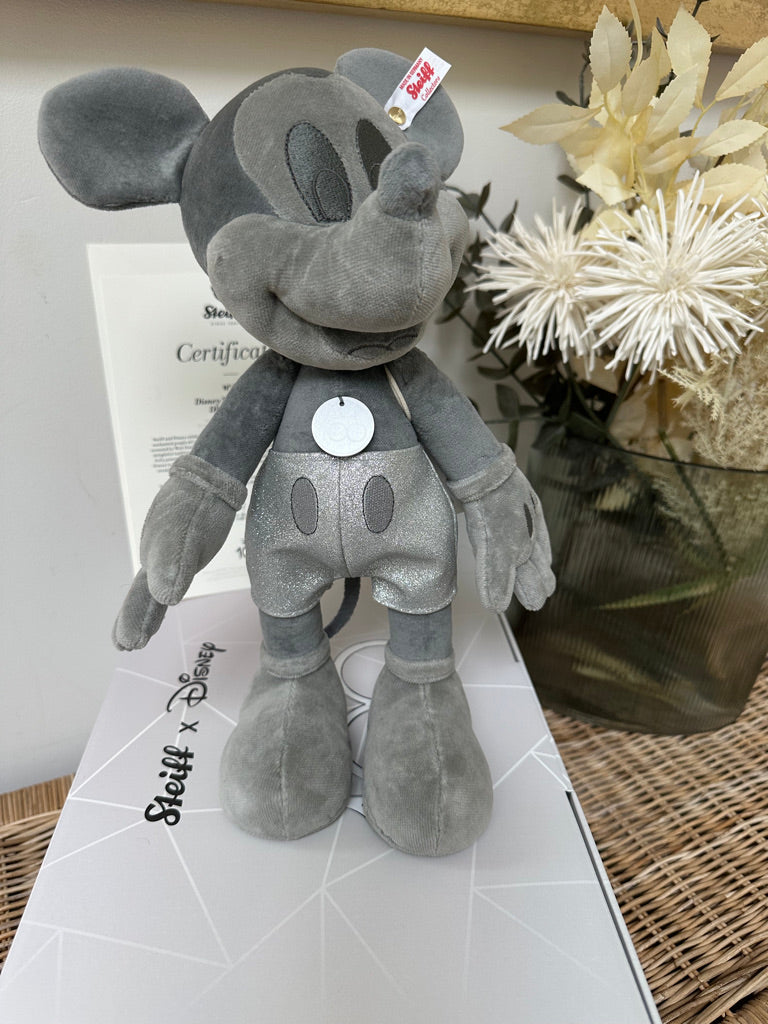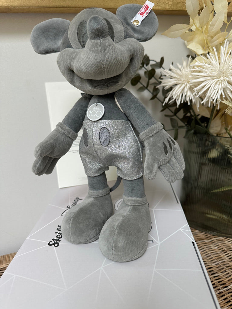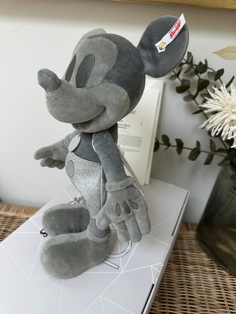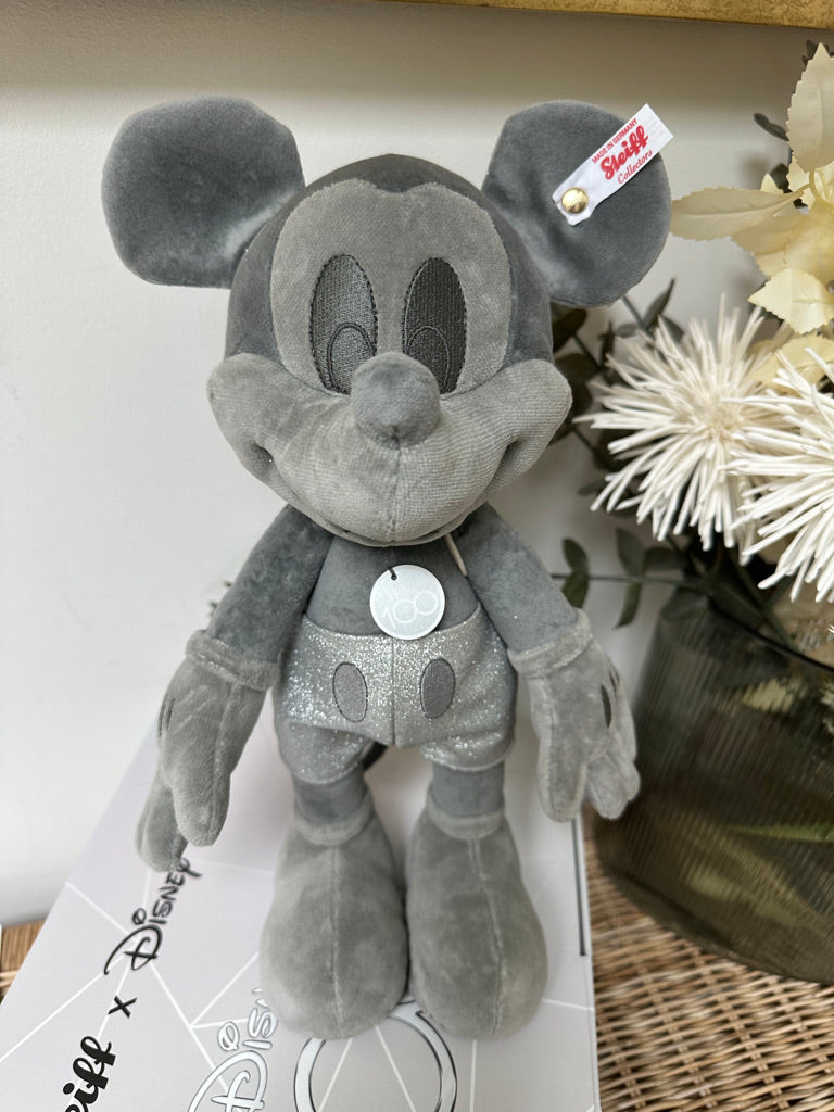 Steiff and Disney celebrate together ! For 100 years, Disney' world-famous characters have enchanted people all over the world. Steiff were one of the first companies to make Mickey Mouse for Walt Disney. This extraordinary Mickey Mouse is presented in a monochrome platinum colour that Disney are using to celebrate their anniversary. Glitter elements compliment the overall design. This exclusive design celebrates and congratulates Disney on their anniversary year.