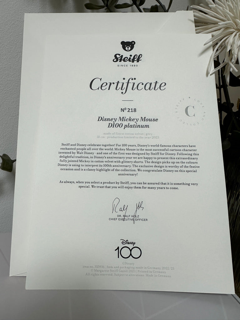 Disney Mickey Mouse D100 Platinum 100th Anniversary Steiff Limited Edition No 218