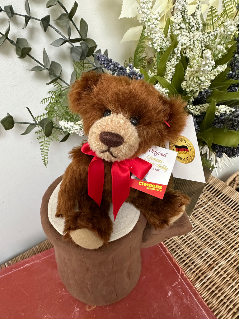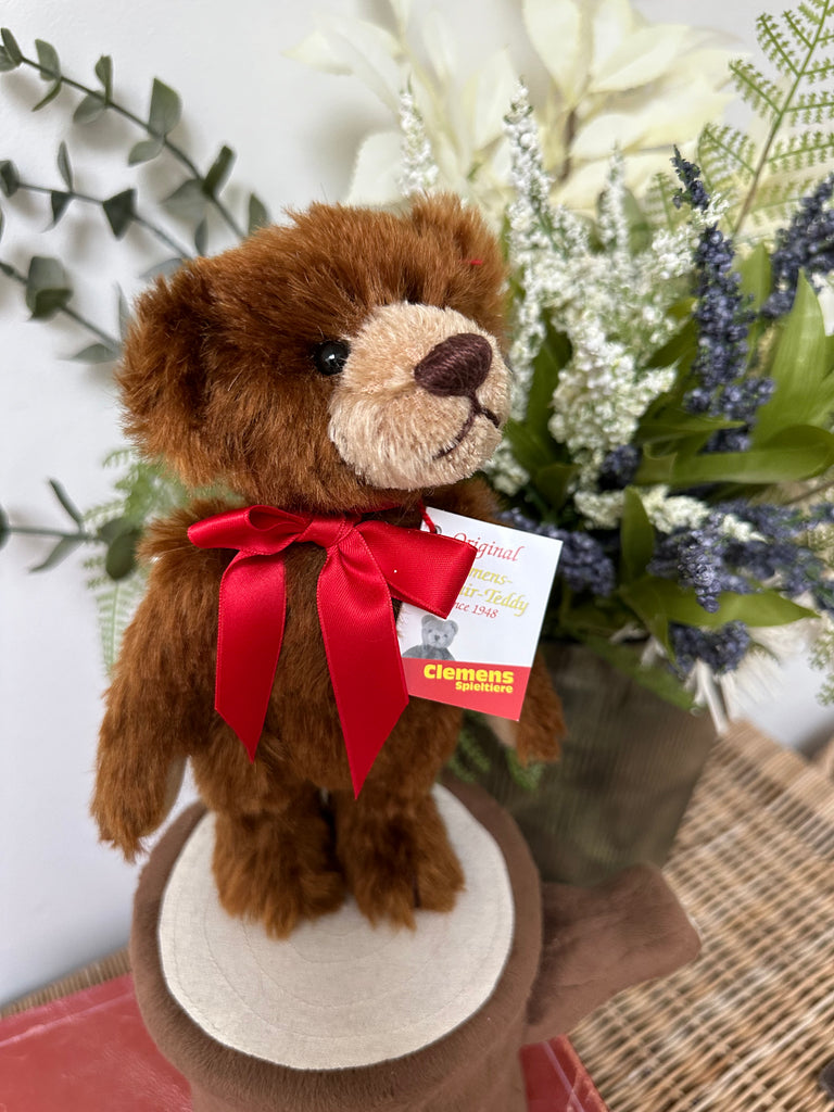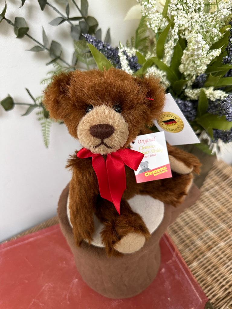 Clemens 20cm fully jointed Golden coloured mohair Teddy Bear with red bow.
