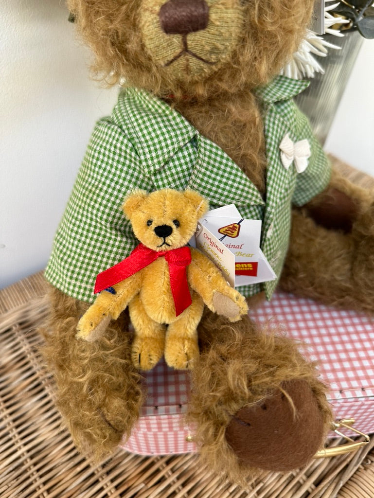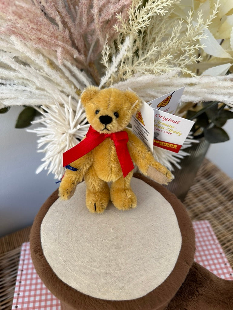 Clemens 10cm Miniature jointed Golden coloured mohair Teddy Bear with red bow.
