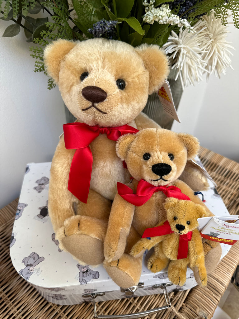 This listing os for the miniature golden bear with red bow, shown with larger bears who are sold separately for size comparison.