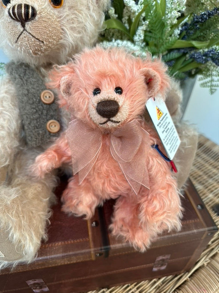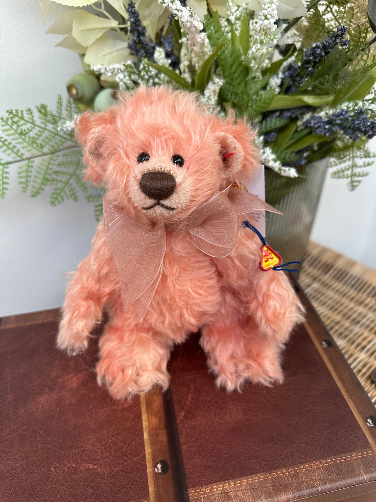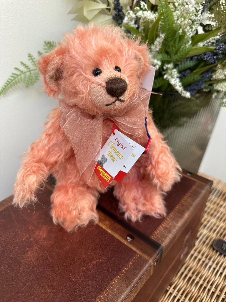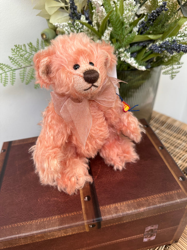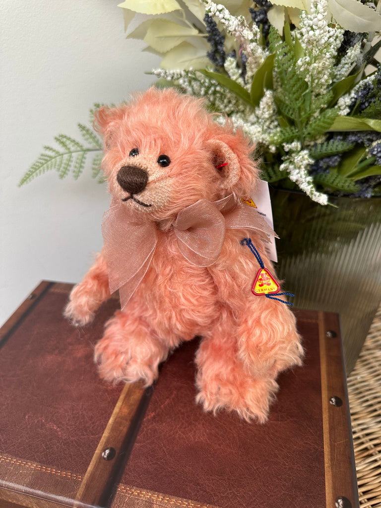 This pretty little bear has been made from a lovely salmon coloured mohair and she has chunky feet so she can stand or sit unaided.